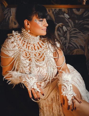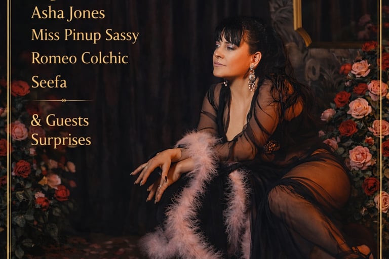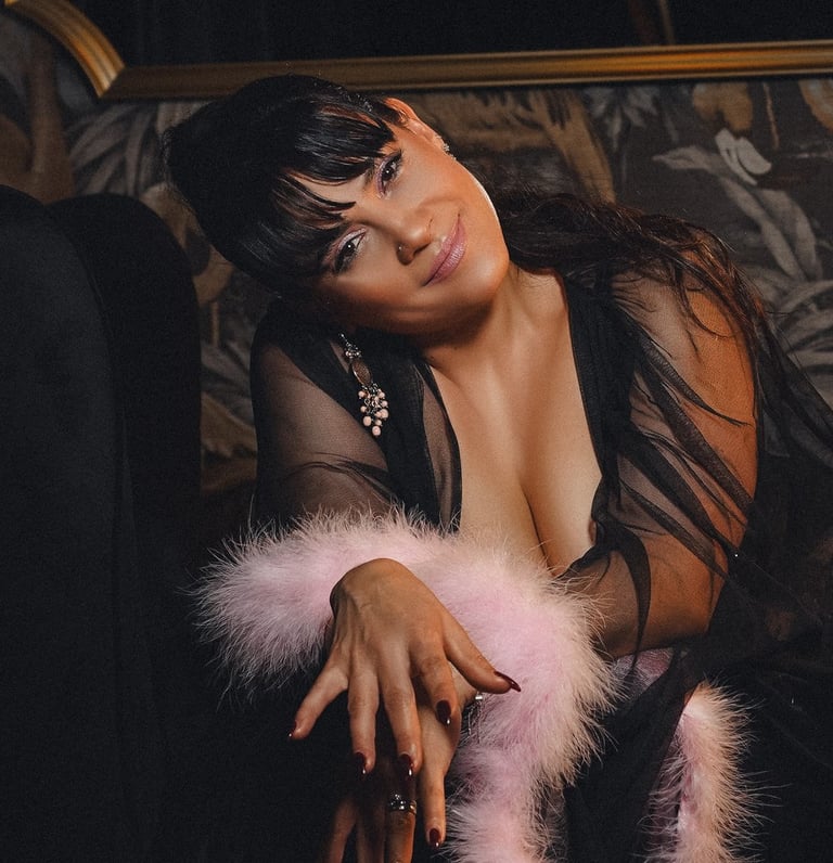 Passionnée par la scène, le burlesque et le cabaret, elle explore ces espaces d’expression incarnés et sensuels où le corps devient langage.